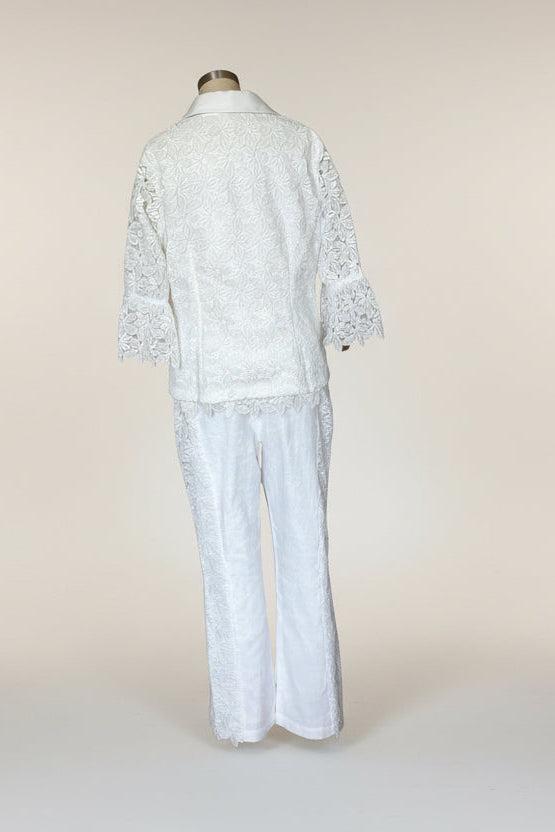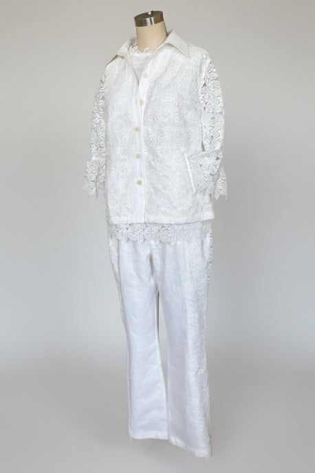 The Sola is a three-piece set that plays with texture and form — a guipure lace jacket layered over a lace camisole and a relaxed pant. The lace brings elegant texture, while the linen lining keeps it breathable.