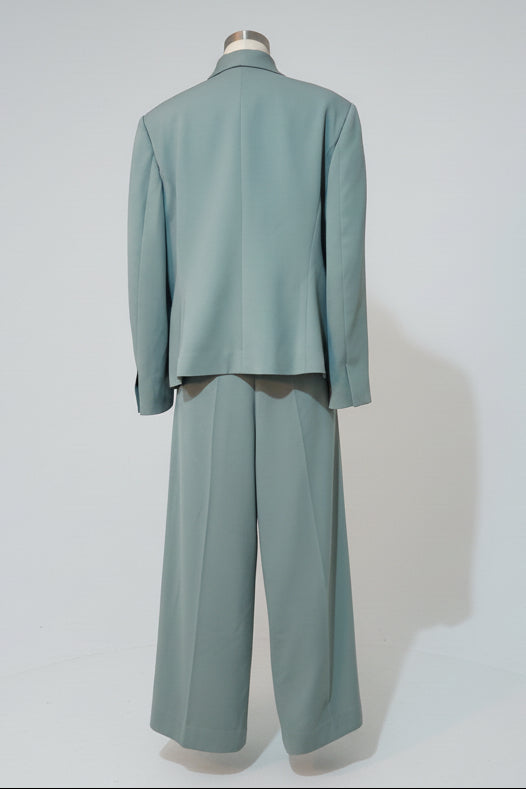 The Rosemary is tailored in fluid acetate crepe with a relaxed shawl collar and wide legged pant. Sage Green and Pink bring a quiet warmth to classic suiting.